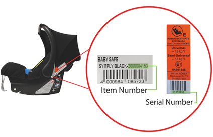 Pour en savoir plus, veuillez contacter notre service clientèle. Il vous demandera d'indiquer le numéro d'article et le numéro de série. Les autocollants comportant le numéro d’article ainsi que le numéro de série sont situés sur le côté gauche de la coque (dans la direction dans laquelle regarde l’enfant qui y est placé), derrière la charnière de l’anse.